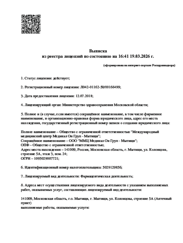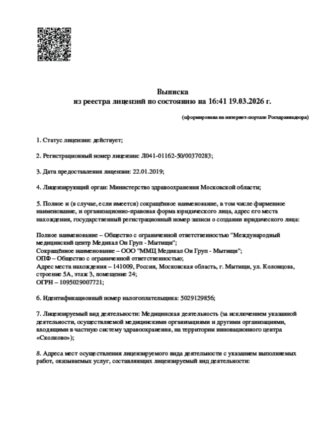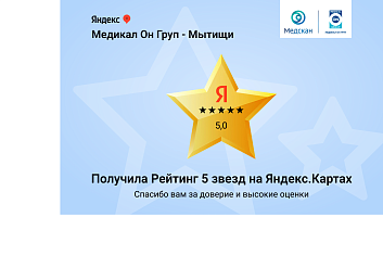 Клиника «Медикал Он Груп – Мытищи» является филиалом международной корпорации, которая насчитывает свыше 50 медицинских учреждений в разных странах мира. Более 20 из них, включая центр «Медикал Он Груп – Мытищи», находятся в России и странах СНГ. «Медикал Он Груп – Мытищи» за время своей работы уверенно зарекомендовала себя как одна из лучших клиник Москвы и Подмосковья! Наш медицинский центр регулярно занимает первые места во Всероссийской премии ПроДокторов в номинации «Лучшие врачи Московской области» (2020, 2021, 2022, 2023), а в 2021 году врач клиники стал обладателем Гран-при премии «Продокторов-2021». В рамках народной премии «Выбор пациентов» портала НаПоправку.ру мы становились победителями в номинациях «Лучшая клиника Москвы» (2023, 2024, 2025) и «Лучший врач» (2023, 2024, 2025). Помимо этого наш медицинский центр удостоен Премии 2ГИС-2023, 2025, а по оценкам пользователей сервиса Яндекс клинике присвоен заслуженный статус «Хорошее место» (2020, 2022, 2023, 2024, 2025, 2026). Более 10 лет подряд корпорация Medical On Group признается порталом SuperJob «привлекательным работодателем».