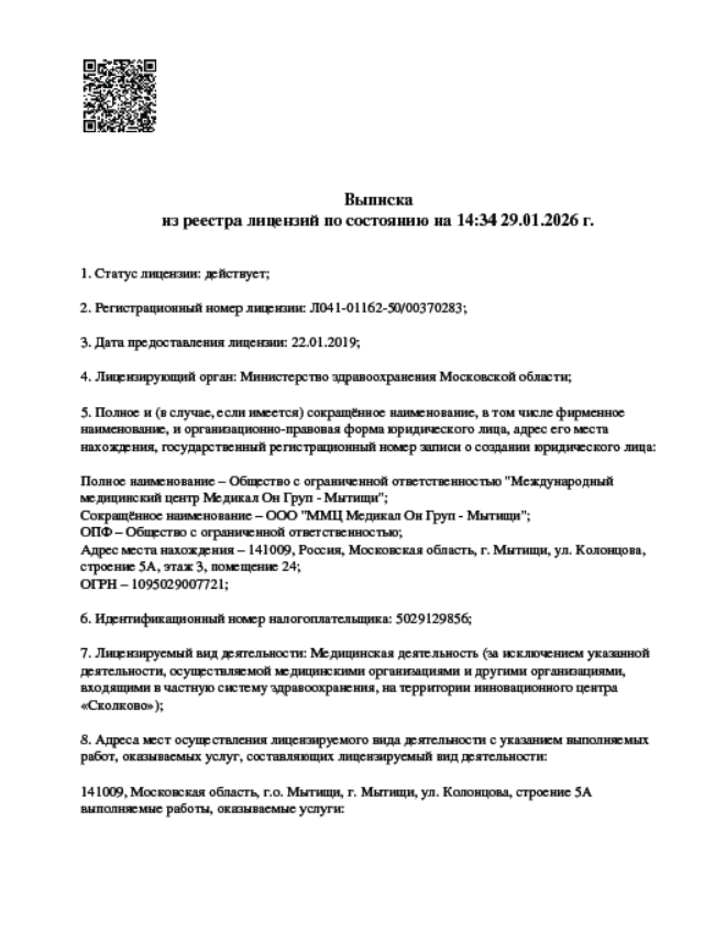 Клиника «Медикал Он Груп – Мытищи» является филиалом международной корпорации, которая насчитывает свыше 50 медицинских учреждений в разных странах мира. Более 20 из них, включая центр «Медикал Он Груп – Мытищи», находятся в России и странах СНГ. «Медикал Он Груп – Мытищи» за время своей работы уверенно зарекомендовала себя как одна из лучших клиник Москвы и Подмосковья! Наш медицинский центр регулярно занимает первые места во Всероссийской премии ПроДокторов в номинации «Лучшие врачи Московской области» (2020, 2021, 2022, 2023), а в 2021 году врач клиники стал обладателем Гран-при премии «Продокторов-2021». В рамках народной премии «Выбор пациентов» портала НаПоправку.ру мы становились победителями в номинациях «Лучшая клиника Москвы» (2023, 2024, 2025) и «Лучший врач» (2023, 2024, 2025). Помимо этого наш медицинский центр удостоен Премии 2ГИС-2023, 2025, а по оценкам пользователей сервиса Яндекс клинике присвоен заслуженный статус «Хорошее место» (2020, 2022, 2023, 2024, 2025). Более 10 лет подряд корпорация Medical On Group признается порталом SuperJob «привлекательным работодателем».
